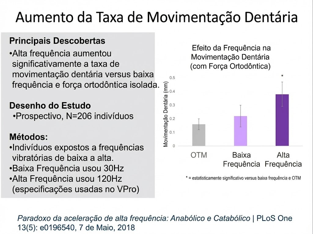 Ler ArtigoO estudo demonstrou que a vibração pode ter efeitos anabólicos (formação óssea) quando aplicada em tecidos saudáveis sem inflamação, mas durante o tratamento ortodôntico, em presença de inflamação, ela potencializa os efeitos catabólicos (reabsorção óssea), acelerando o movimento dentário.