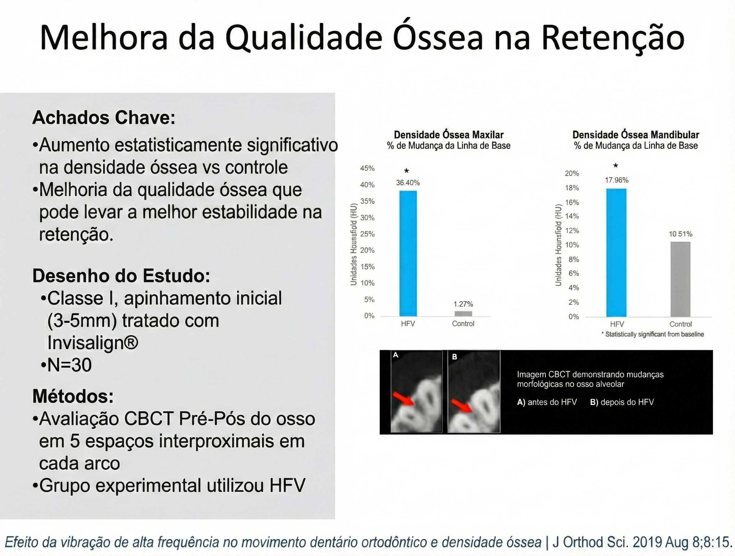 Ler ArtigoO uso da vibração acelerou significativamente a troca dos alinhadores (5,2 dias vs 8,7 dias no grupo controle), resultando em redução do tempo total de tratamento (135 dias vs 252 dias). Além disso, os pacientes com HFV apresentaram um aumento estatisticamente significativo na densidade óssea alveolar após o tratamento, enquanto o grupo controle não mostrou alterações relevantes.
