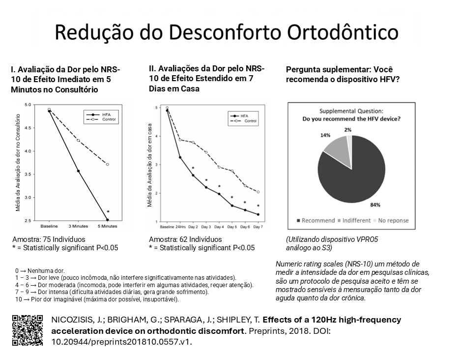 Ler ArtigoO estudo multicêntrico, com 75 pacientes, demonstrou que o uso do dispositivo reduziu significativamente a dor imediata em até 5 minutos após a troca dos alinhadores e também diminuiu de forma consistente o desconforto ao longo de 7 dias. A adesão foi altíssima (99,6%), sem efeitos adversos reportados.