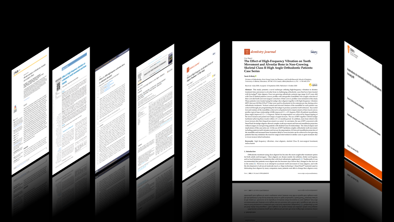 Ler ArtigoA vibração de alta frequênciaestimula o ligamento periodontal, aumenta a atividade osteoclástica e a remodelação óssea, resultando emmaior velocidade de movimentação dentária, com menor risco de reabsorção radicular. Os estudos avaliados mostraram que seu usoreduz o tempo de troca dos alinhadores (5–7 dias)sem comprometer a previsibilidade do tratamento, além de trazer benefícios adicionais comoredução da dor, melhor encaixe dos alinhadores e maior estabilidade pós-tratamento.