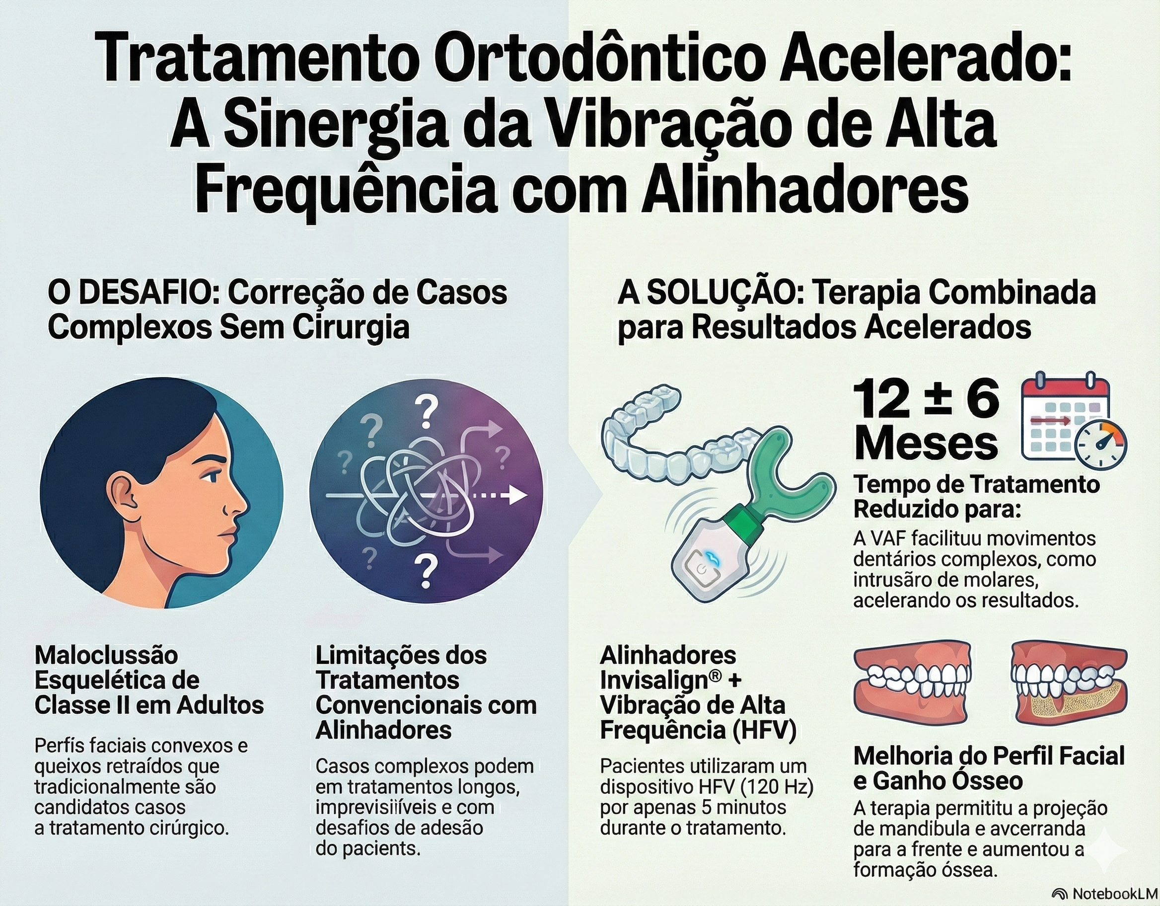 4. O estímulo vibratório pareceu induzir formação óssea labial, reduzindo riscos futuros de recessão gengival.👉 Em resumo: A vibração de alta frequência potencializa os alinhadores, acelera movimentos complexos e melhora perfil e saúde óssea em pacientes Classe II sem necessidade de cirurgia.